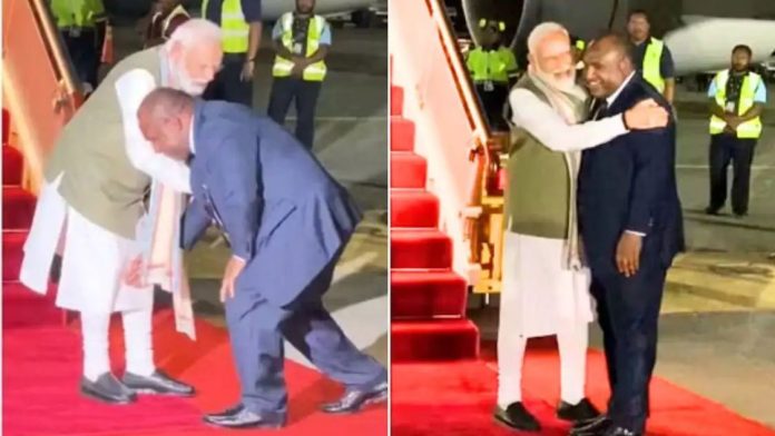 स्थानिक वेळेनुसार रात्री पंतप्रधान मोदींचं विमान पापुआ न्यू गिनीमध्ये लॅण्ड झालं. पंतप्रधान मोदींचं स्वागत करण्यासाठी पापुआ न्यू गिनीचे पंतप्रधान जेम्स मारपे हे स्वत: उपस्थित होते. विशेष म्हणजे पंतप्रधान मोदी विमानात बाहेर आल्यानंतर आधी मारपे यांनी मोदींची गळाभेट घेतली. त्यानंतर मारपे यांनी चक्क पंतप्रधान मोदींच्या पाया पडले. सध्या सोशल मीडियावर मारपे यांनी भारतीय प्रथा परंपरेनुसार मोदींचा आशीर्वाद घेतल्याबद्दल त्यांच्यावर कौतुकाचा वर्षाव होताना दिसतोय.