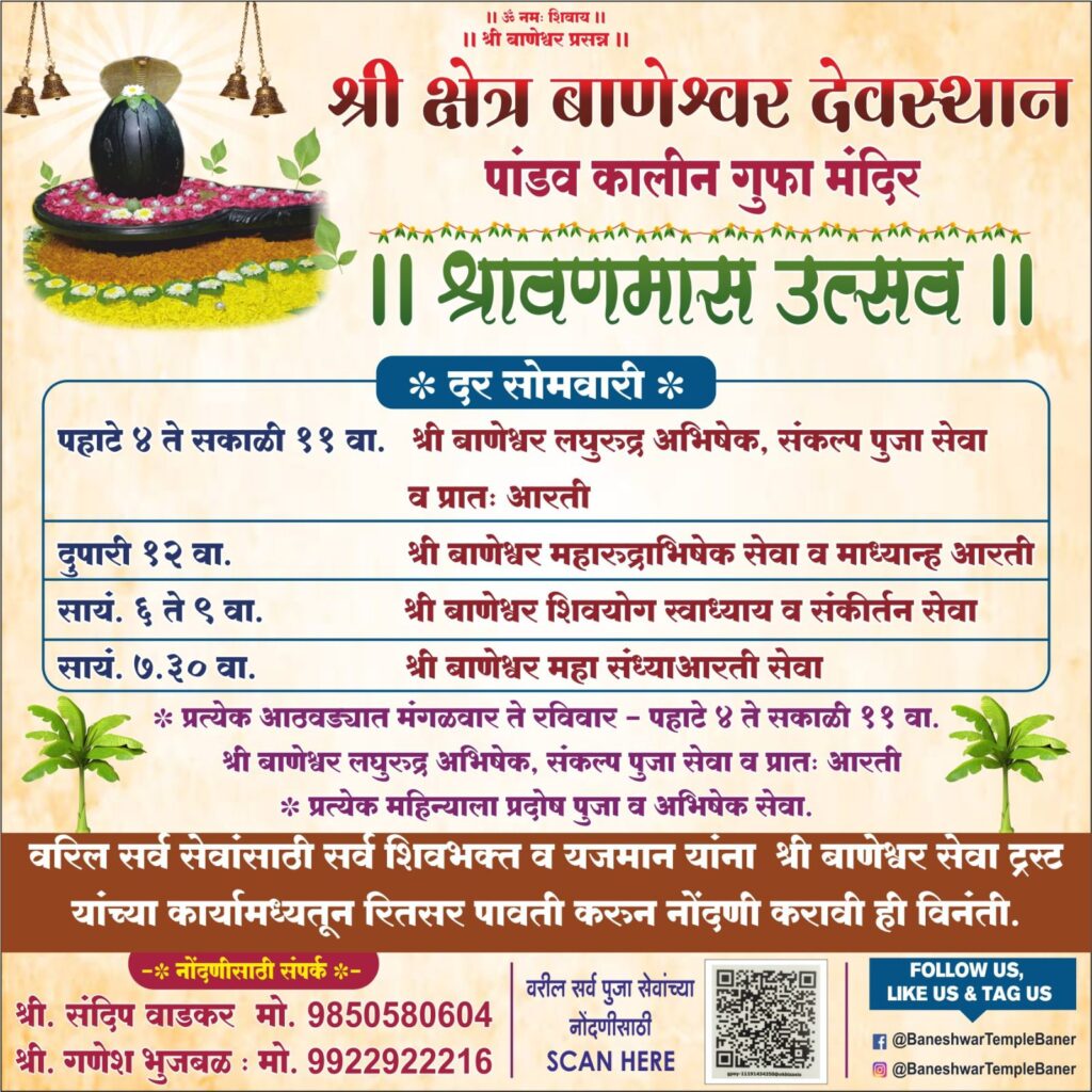 या धार्मिक विधी व अभिषेक चा लाभ जास्तीत जास्त नागरिकांनी घ्यावा असे आवाहन श्री बाणेश्वर सेवा ट्रस्ट चे अध्यक्ष संदीप वाडकर यांनी केले आहे.