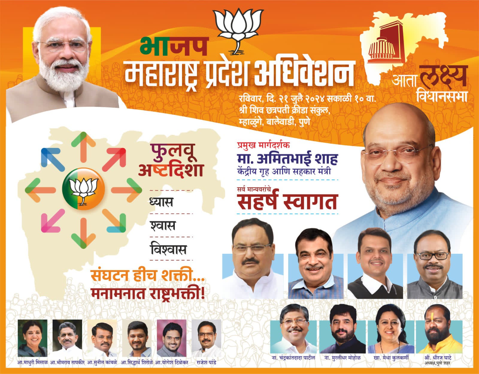 भारतीय जनता पक्षाच्या प्रदेश कार्यकारिणीची बालेवाडीतील श्री शिवछत्रपती क्रीडा संकुलात आज रविवारी (२१ जुलै) बैठक आयोजित करण्यात आली आहे. बैठकीस केंद्रीय गृहमंत्री अमित शहा यांच्यासह वरिष्ठ पदाधिकारी, मंत्री उपस्थित राहणार आहे. बैठकीसाठी एक हजार पोलिसांचा कडक बंदोबस्त बालेवाडी परिसरात तैनात करण्यात आला आहे.