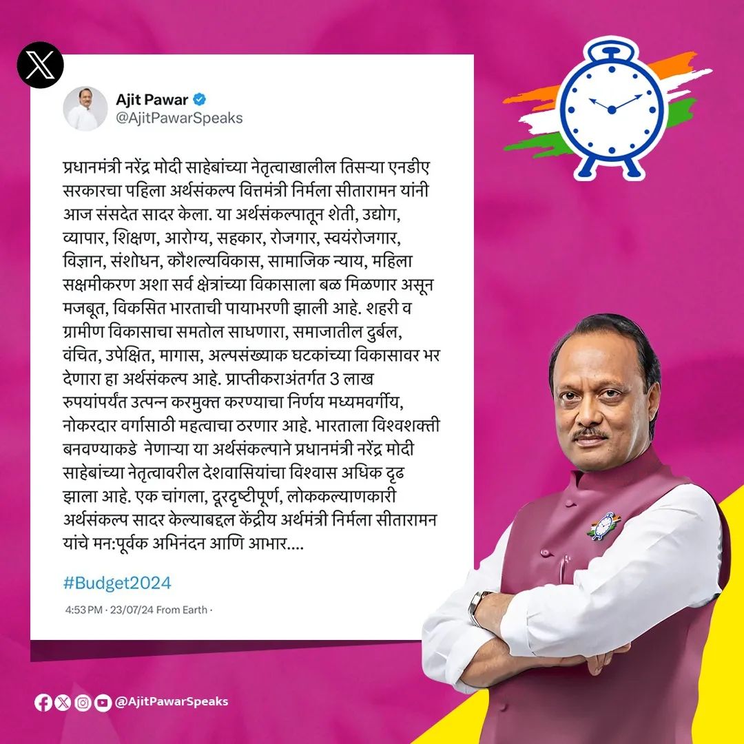 प्रधानमंत्री नरेंद्र मोदी यांच्या नेतृत्वाखालील सलग तिसऱ्या एनडीए सरकारचा पहिलाच अर्थसंकल्प महाराष्ट्र आणि देशवासियांची मने जिंकणारा अर्थसंकल्प ठरला असू मध्यमवर्गीय आणि नोकरदार वर्गाच्या आशा-आकांक्षा-अपेक्षांची पूर्तता करणारा, शेती, उद्योग, व्यापार, शिक्षण, आरोग्य, सहकार, रोजगार, स्वयंरोजगार, विज्ञान, संशोधन, कौशल्यविकास, सामाजिक न्याय, महिला सक्षमीकरण अशा सर्व क्षेत्रांच्या विकासाला बळ देणारा, मजबूत-विकसित भारताची पायाभरणी करणारा, देशाला विश्वशक्ती बनवण्याच्या वाटेवर नेणारा हा अर्थसंकल्प आहे, अशा शब्दात केंद्रीय अर्थमंत्री निर्मला सीतारामन यांनी सादर केलेल्या अर्थसंकल्पाचे महाराष्ट्राचे अर्थमंत्री तथा उपमुख्यमंत्री अजित पवार यांनी कौतुक केले.