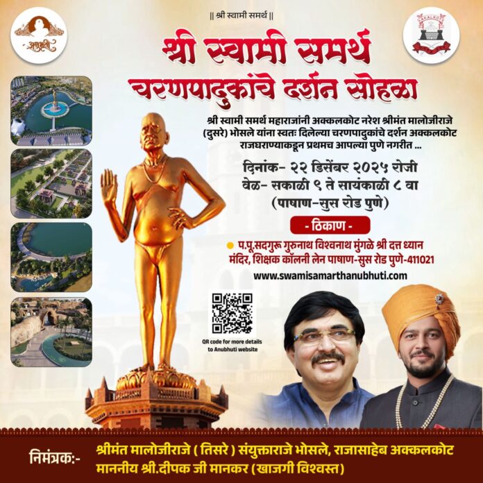अक्कलकोट राजघराण्यांचे श्रीमंत मालोजीराजे भोसले (द्वितीय) यांना सद्गुरु श्री स्वामी समर्थ महाराजांनी प्रत्यक्ष कृपावंत होऊन आपल्या पवित्र पादुका प्रदान केल्या होत्या. या पवित्र चरणकमलांचे दर्शन विद्यमान नरेश श्रीमंत मालोजीराजे संयुक्ताराजे भोसले तिसरे यांच्या पुढाकाराने आयोजित करण्यात आले आहे. अक्कलकोट राजघराण्याकडून दीडशे वर्षानंतर प्रथमच पुण्यनगरीतील भाविकांसाठी सोमवारी सकाळी ९ ते रात्री ८ पर्यंत या पादुका दर्शनाचा लाभ पाषाण सुसरोड येथे घेता येणार आहे.