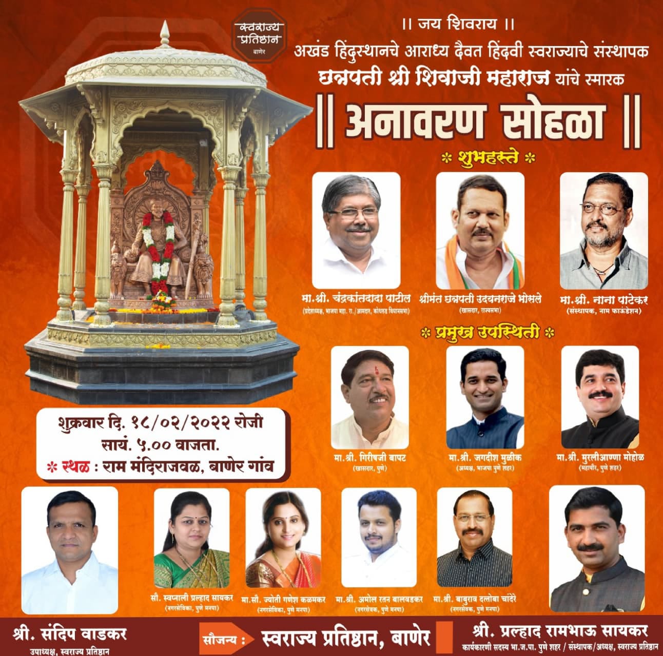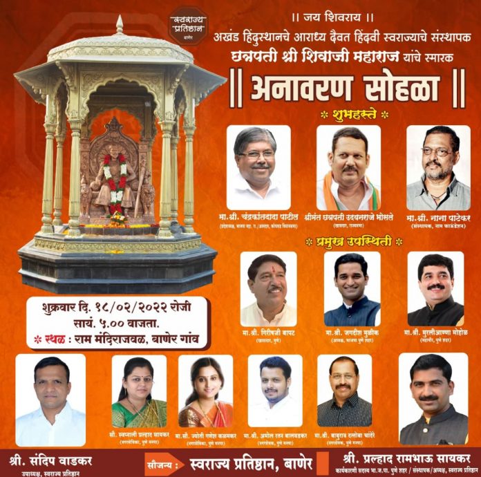 बाणेर गावच्या शिरपेचात मानाचा तुरा लावणारा बहुप्रतिक्षित ऐतिहासिक सुवर्ण क्षण आला आहे. उद्या शुक्रवार दिनांक १८ फेब्रुवारी २०२२ रोजी सायंकाळी ५ वाजता स्वराज्य प्रतिष्ठान, बाणेर यांच्या प्रयत्नातून साकारण्यात आलेल्या अखंड हिंदूस्तानचे आराध्य दैवत छत्रपती शिवाजी महाराज यांच्या भव्यदिव्य स्मारकाचा लोकार्पण सोहळा श्रीमंत छत्रपती उदयनराजे भोसले (खासदार राज्यसभा), आमदार चंद्रकांतदादा पाटील (भाजपा प्रदेश अध्यक्ष महाराष्ट्र राज्य), सिनेअभिनेते नाना पाटेकर (संस्थापक नाम फाउंडेशन) यांच्या शुभहस्ते संपन्न होणार आहे.