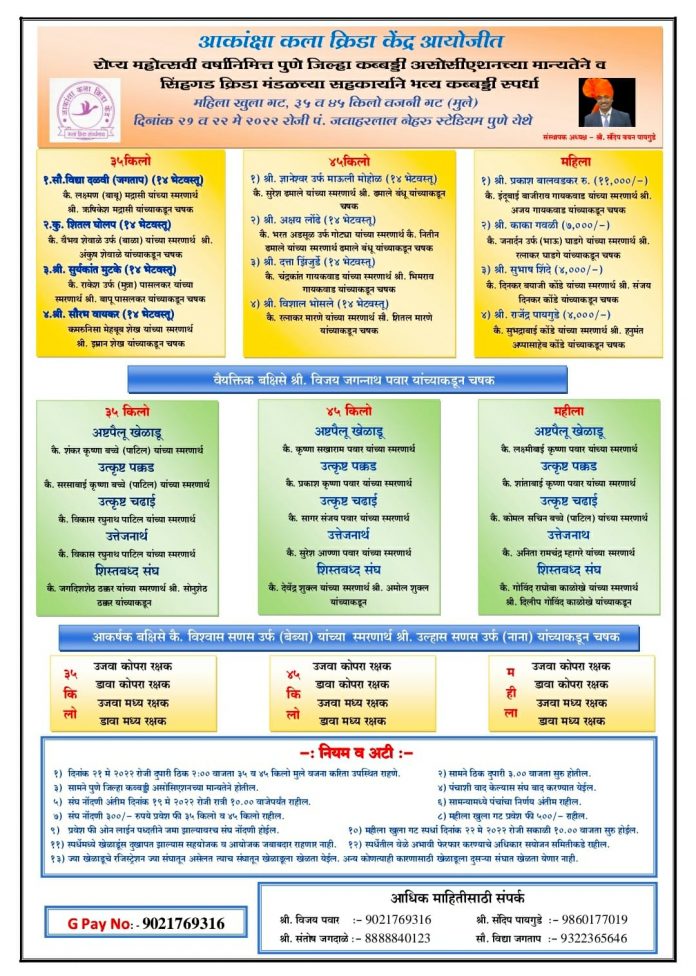 या स्पर्धेत भाग घेवू इच्छिनाऱ्या संघानी संदिप पायगुडे – 9860177019, विजय पवार – 9021769316, संतोष जगदाळे –8888840123, विद्या जगताप – 9322365646 यांच्याशी संपर्क साधावा.