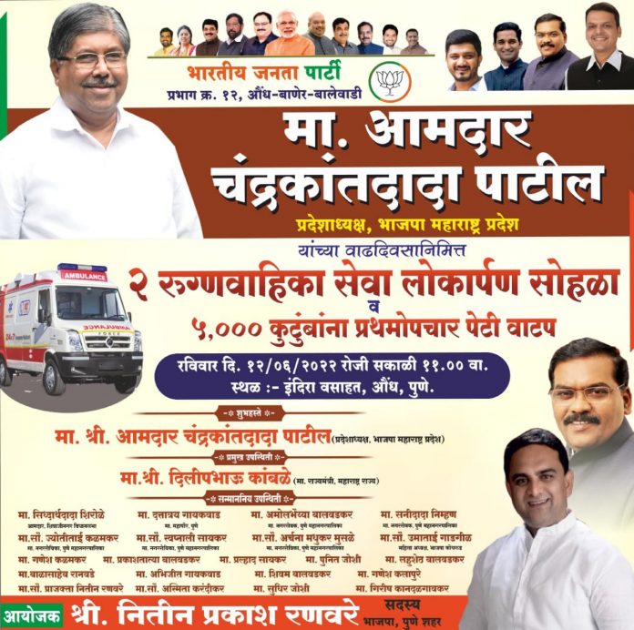 भारतीय जनता पार्टीचे महाराष्ट्र राज्य प्रदेशाध्यक्ष आमदार चंद्रकांतदादा पाटील यांच्या वाढदिवसाचे निमित्त साधून युवा नेते नितीन रणवरे यांच्यावतीने परिसरातील सर्वसामान्य नागरिकांसाठी एकाच वेळी दोन रुग्णवाहिका सेवा लोकार्पण सोहळा आणि परिसरामध्ये प्रथमत पाच हजार कुटुंबांना प्रथमोपचार पेटी चे वाटप रविवार दिनांक १२/०६/२०२२ रोजी सकाळी ११ वाजता इंदिरा वसाहत औंध येथे महाराष्ट्र राज्य प्रदेशाध्यक्ष आमदार चंद्रकांतदादा पाटील यांच्या शुभहस्ते आणि माजी राज्यमंत्री दिलीप कांबळे यांच्या उपस्थित संपन्न होणार आहे.