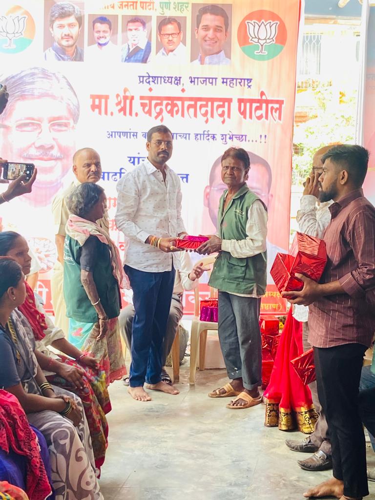 भाजपा प्रदेशाध्यक्ष आमदार चंद्रकांत पाटील यांच्या वाढदिवसाच्या निमित्ताने आणि माजी नगरसेवक अमोल बालवडकर व माजी नगरसेवक सनी निम्हण यांच्या मार्गदर्शनाखाली भाजपा युवा नेते सचिन मानवतकर यांच्या वतीने कस्तुरबा वसाहत येथील जनसंपर्क कार्यालया मध्ये प्रभाग क्रमांक 12 मधील औंध – बालेवाडी मधील सर्व सफाई कामगारांना भेटवस्तू व मिठाई वाटप करण्यात आली.